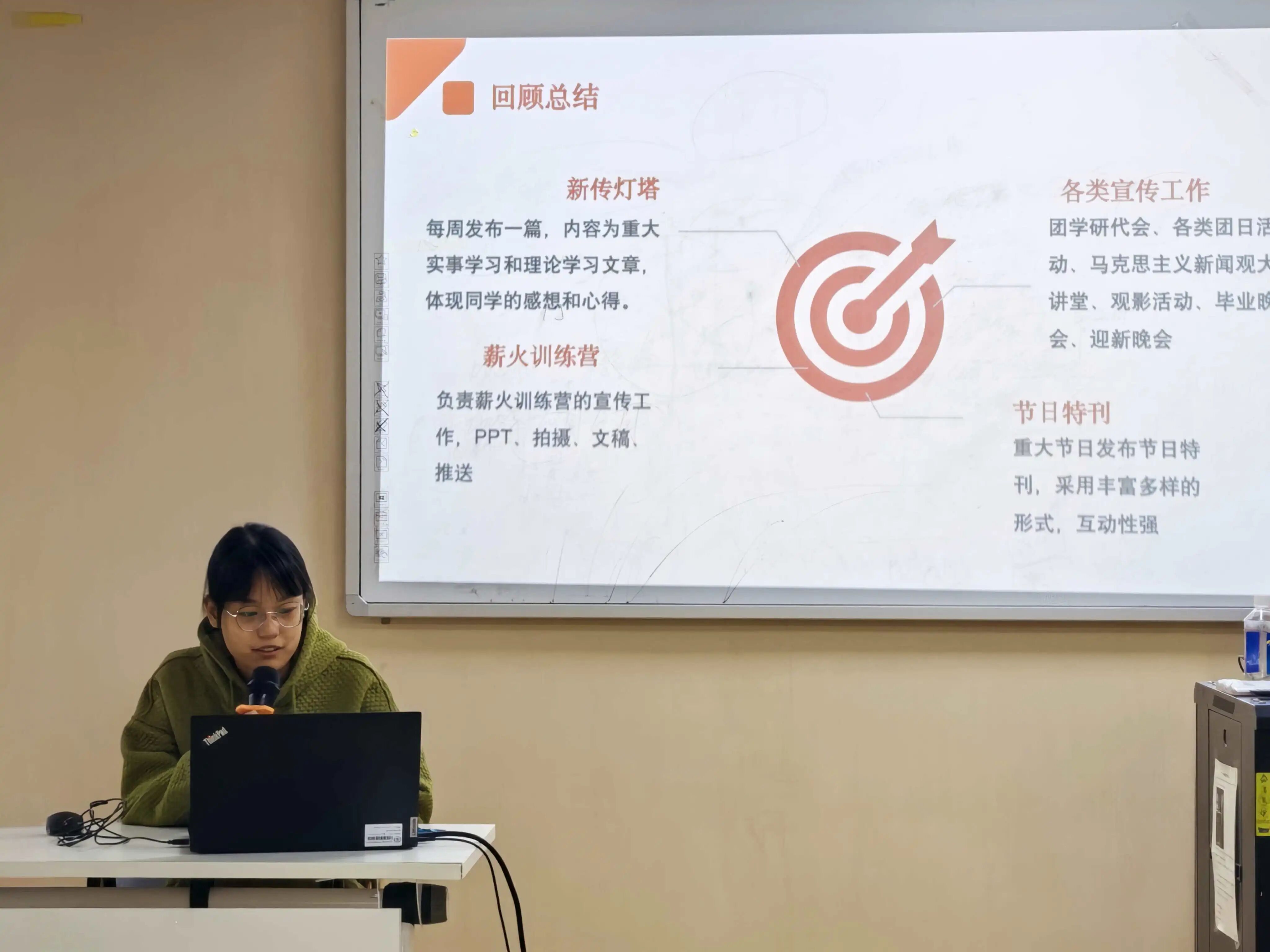 我院团委温馨代表团委对接下来的未来工作进行介绍,围绕新学期重点任务作了全面部署与报告。会议首先宣布,薪火训练营暨初级团校将作为系统性培养平台于每周定期举行,不断提升团员骨干的理论素养与实践能力。会议同时对加入团委大家庭的新同学表示了热烈欢迎,期待新鲜血液能为团学工作注入活力。