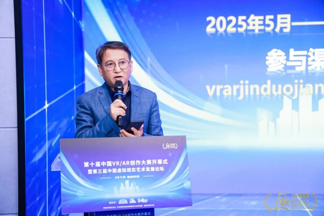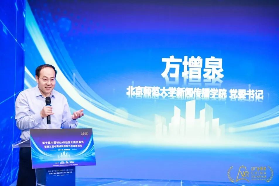 2025年5月23日上午,第十届中国VR/AR创作大赛开幕式暨第三届中国虚拟现实艺术发展论坛在北京师范大学新闻传播学院小白楼新五维空间隆重举行。
