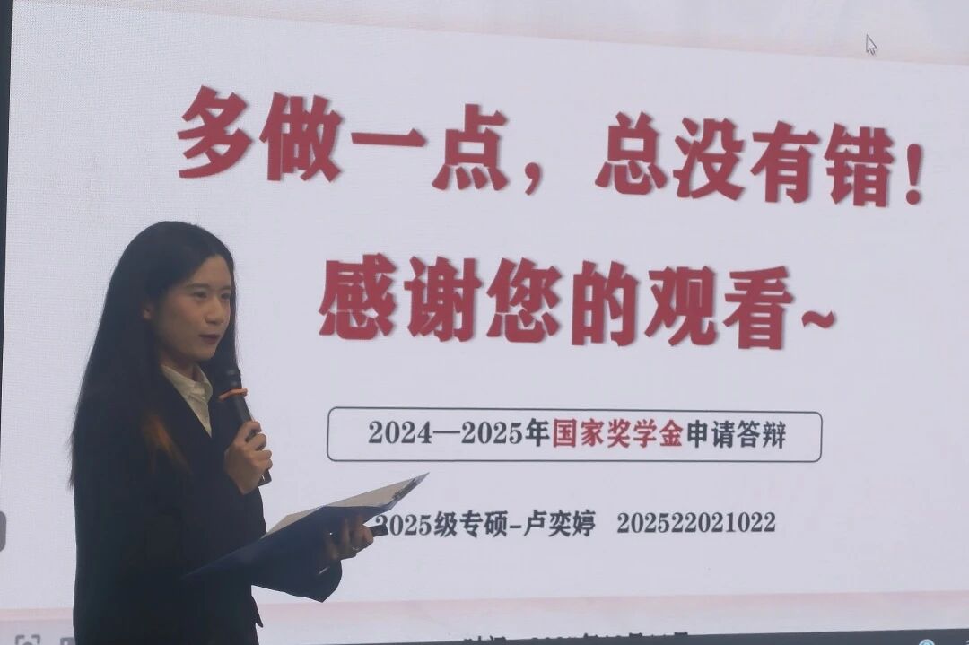 本次评选包括博士生、学术型研究生、专业型研究生、本科生四个类别,符合国家奖学金评选条件的26名学生在评选会上按不同类别根据顺序依次进行了答辩。答辩现场,既有思维的深度碰撞,也有轻松愉快的交流氛围。博士生们展现了深厚的学术积淀,他们的汇报聚焦学科前沿,研究成果丰硕,体现了严谨的科研态度和卓越的创新精神。学术硕士的同学们则在理论探索上深耕不辍,扎实的学术功底和清晰的科研逻辑赢得了在场师生的频频赞许。专业硕士的学子们将理论与实践完美结合,分享了在实习、项目中的宝贵经历与解决方案,彰显了出色的职业胜任力。本科生同学们作为后起之秀,表现同样毫不逊色。他们不仅在学业上名列前茅,更在学生工作、科创竞赛、社会实践等领域全面开花,展现了新时代青年的无限潜能。